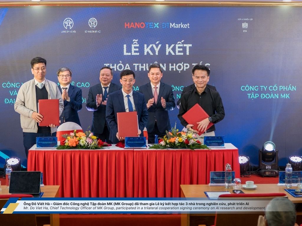 During the event, Mr. Do Viet Ha, Chief Technology Officer of MK Group, participated in a trilateral AI research and development cooperation signing ceremony between the Hanoi Department of Science and Technology, the High-Tech and Innovation Park under Vietnam National University, Hanoi, and MK Group—further strengthening the national AI innovation ecosystem.